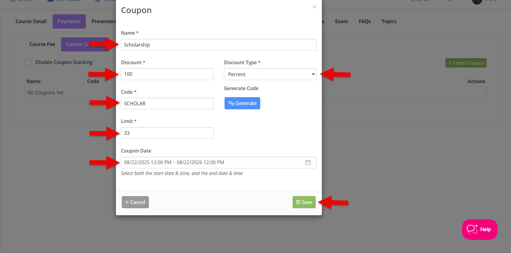 *Disable Coupon Stacking would mean someone cannot use multiple coupons, only one can be applied at a time. If this box is not selected, people could use multiple coupons to furtherdiscount the course price.