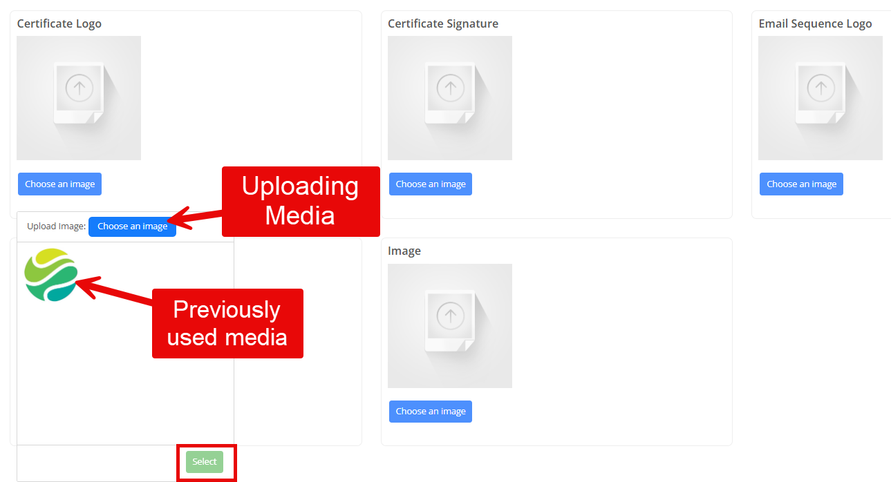 To add your own images, select choose an image, upload the file or easily select previously used media, and hit Select.