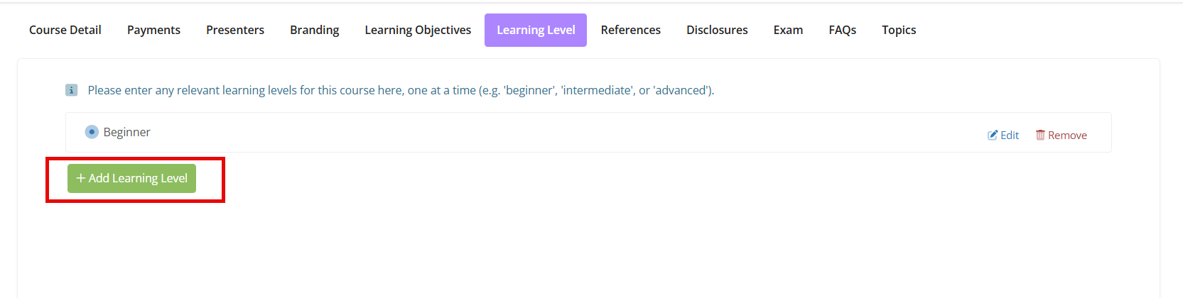 Under the Learning Levels tab, you will enter any relevant learning levels for your training, one at a time.