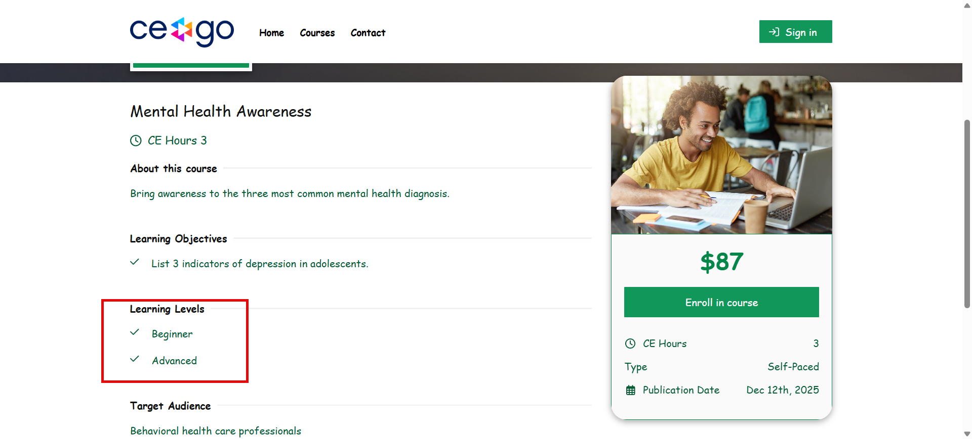 Learning Levels will be displayed on your course Landing Page.