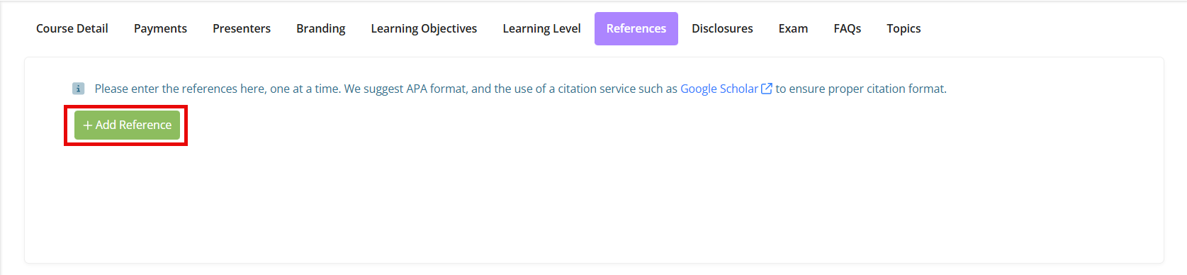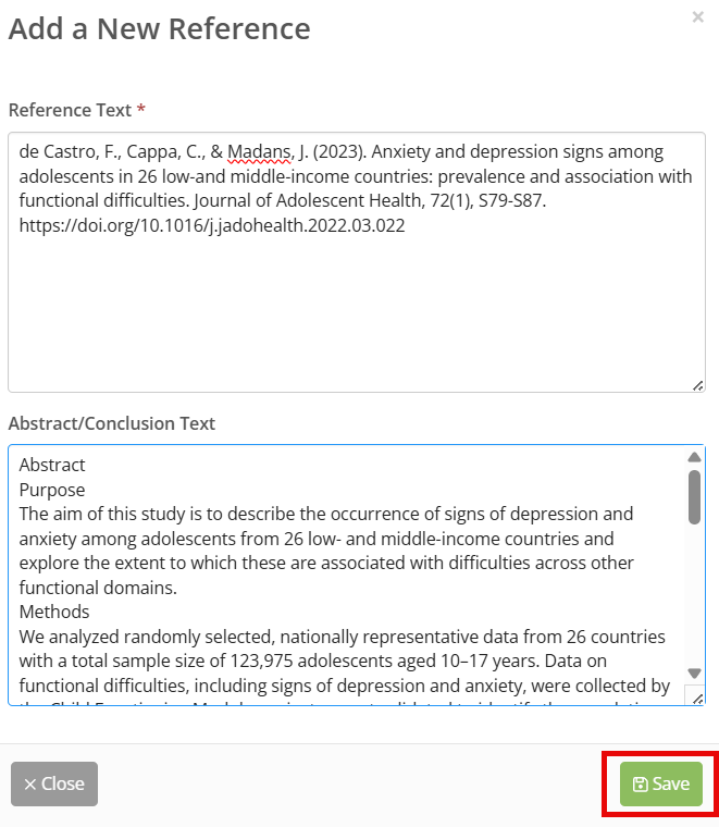 Create References one at a time (APA Format), including Reference Text (who or what the reference is) with DOI (if applicable), and Abstract/Conclusion Text (how the reference supports and relates to content and topics presented during this training). Click Save and continue until all your References have been entered.