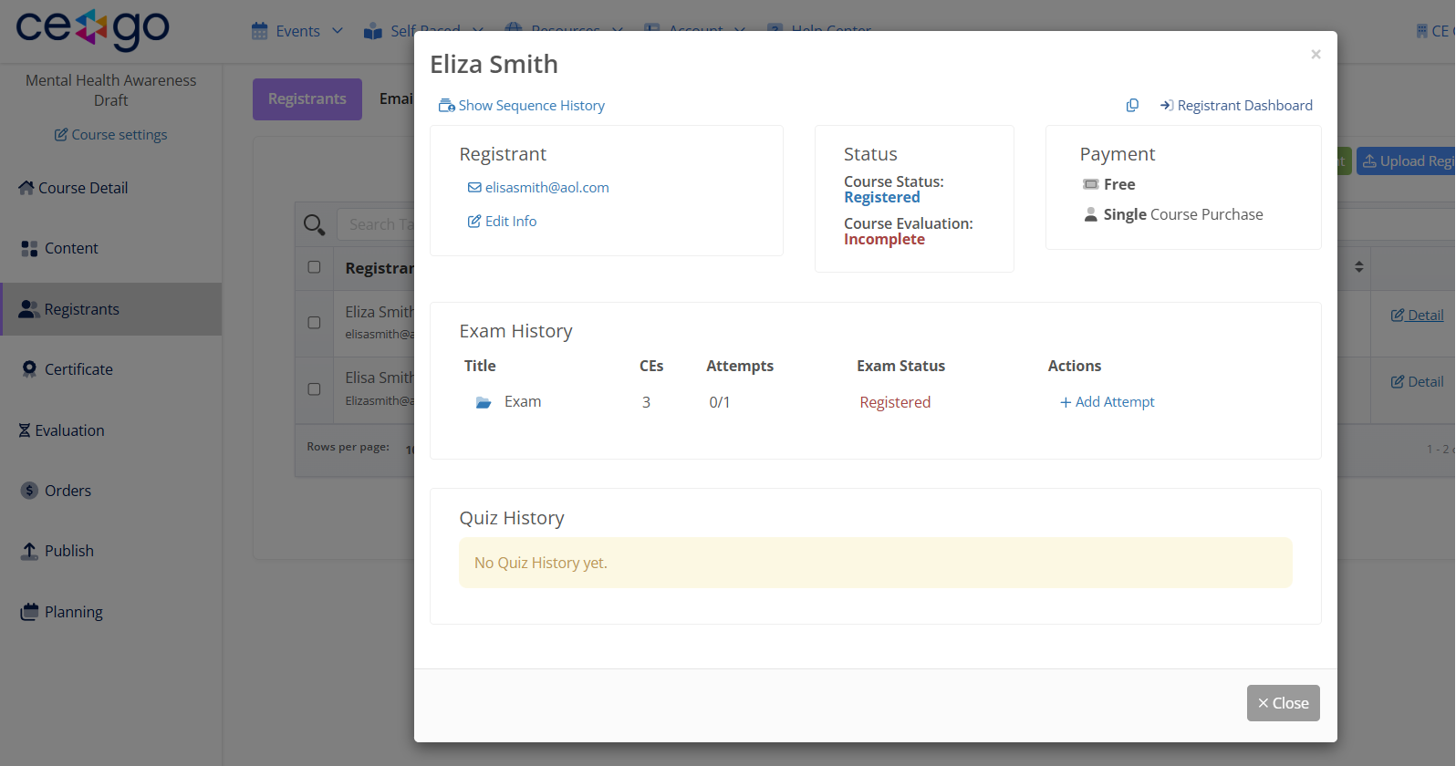Under the Actions column, select Detail to open the Attendee Modal with information about that attendee. The Attendee Modal will include any emails sent to the attendee, if the attendee still has access to the course, if they've completed the course, how much they paid, and editable attendee information such as name and email.