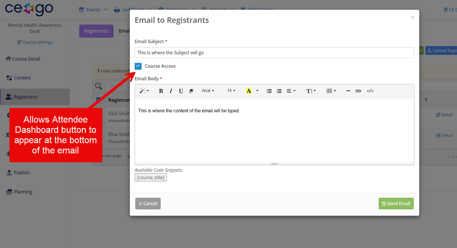 Enter your Email Subject, check the box if you want their Attendee Dashboard to appear in the email, create the content of the email, and hit Send Email.