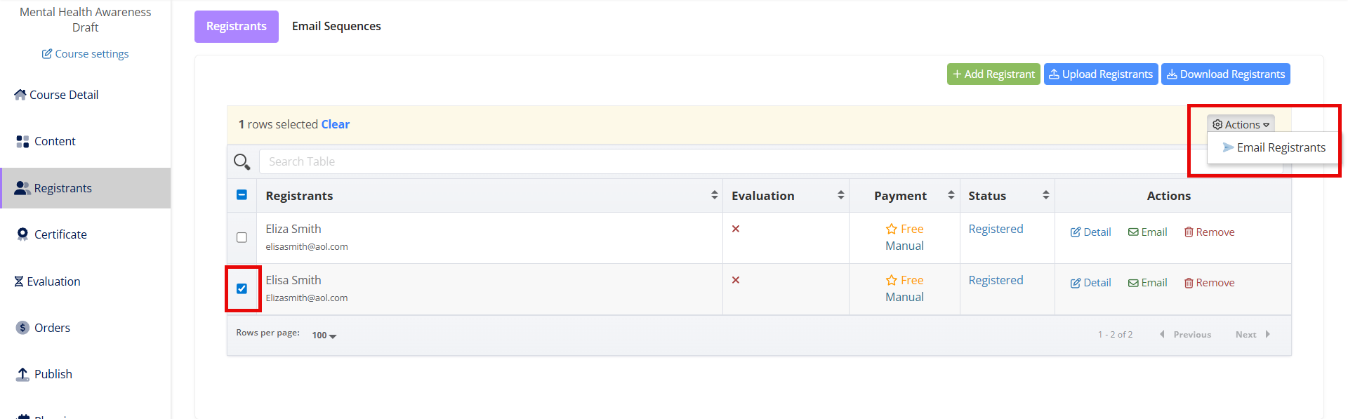 Checking the box next to a name will make the Actions menu appear, where you can immediately send an email to the attendee that has been selected.