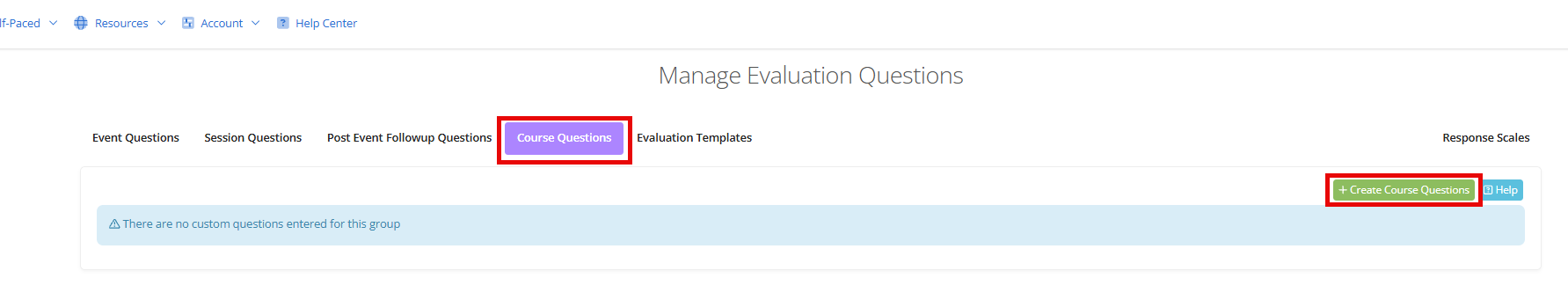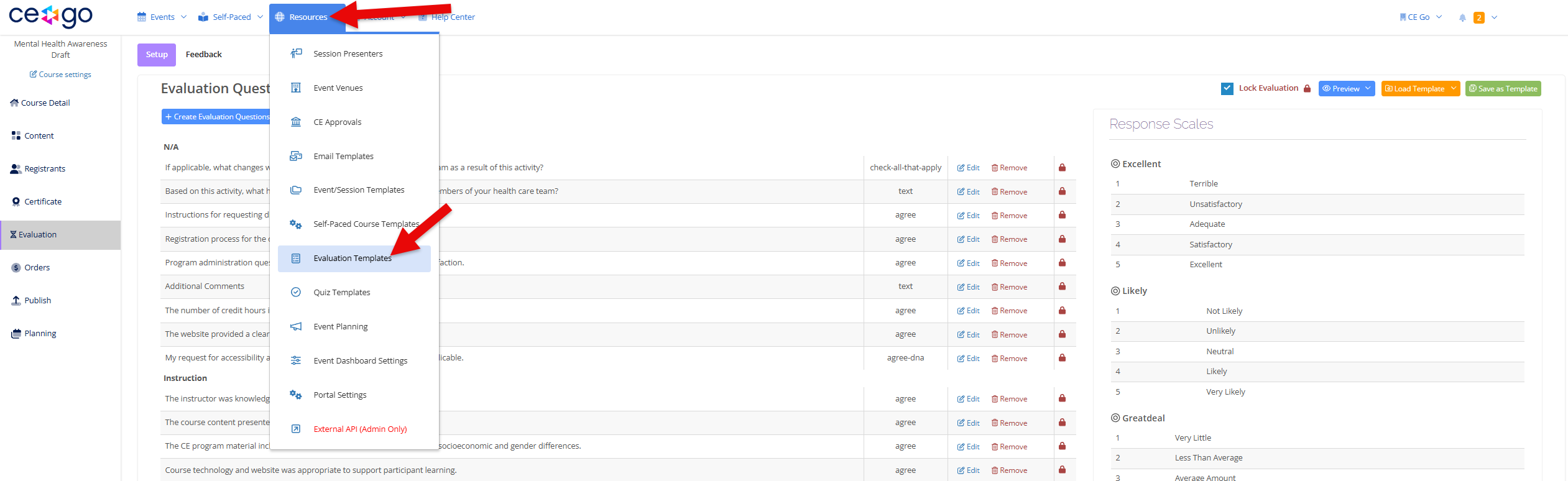 To add an evaluation question, navigate to Resources, Evaluation Templates, and select Course Questions.