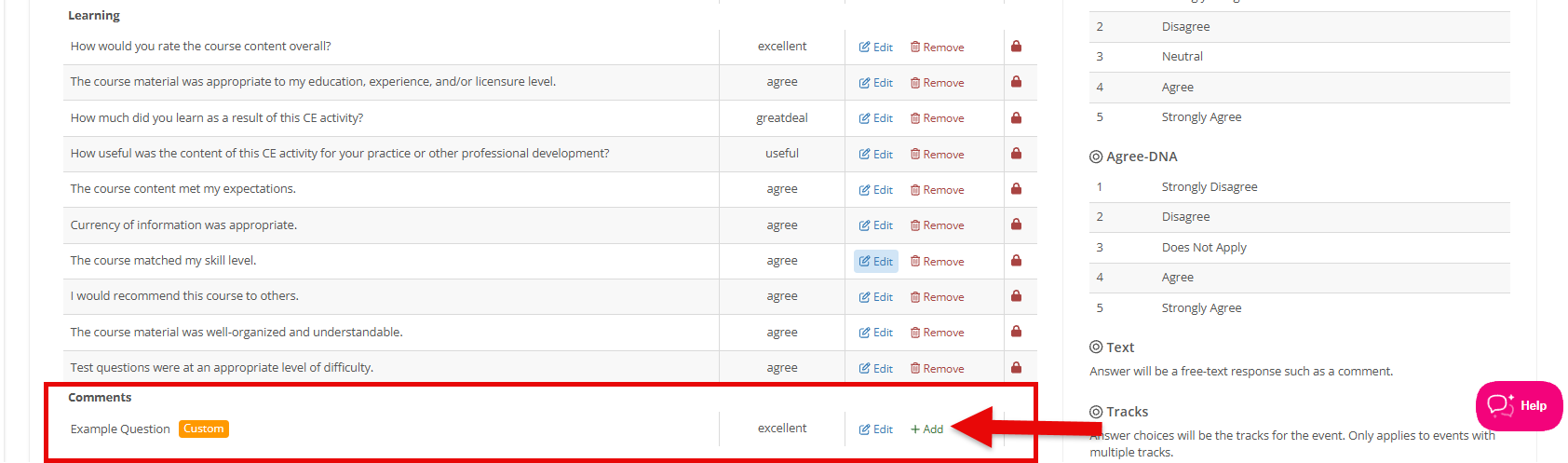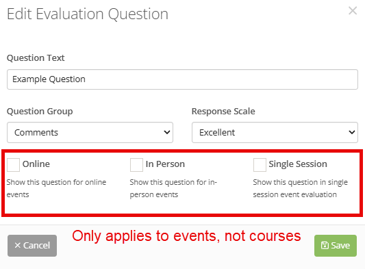 Under Evaluation Questions, you will be able to review and customize the required evaluation form an attendee will be asked to complete at the conclusion of the course.