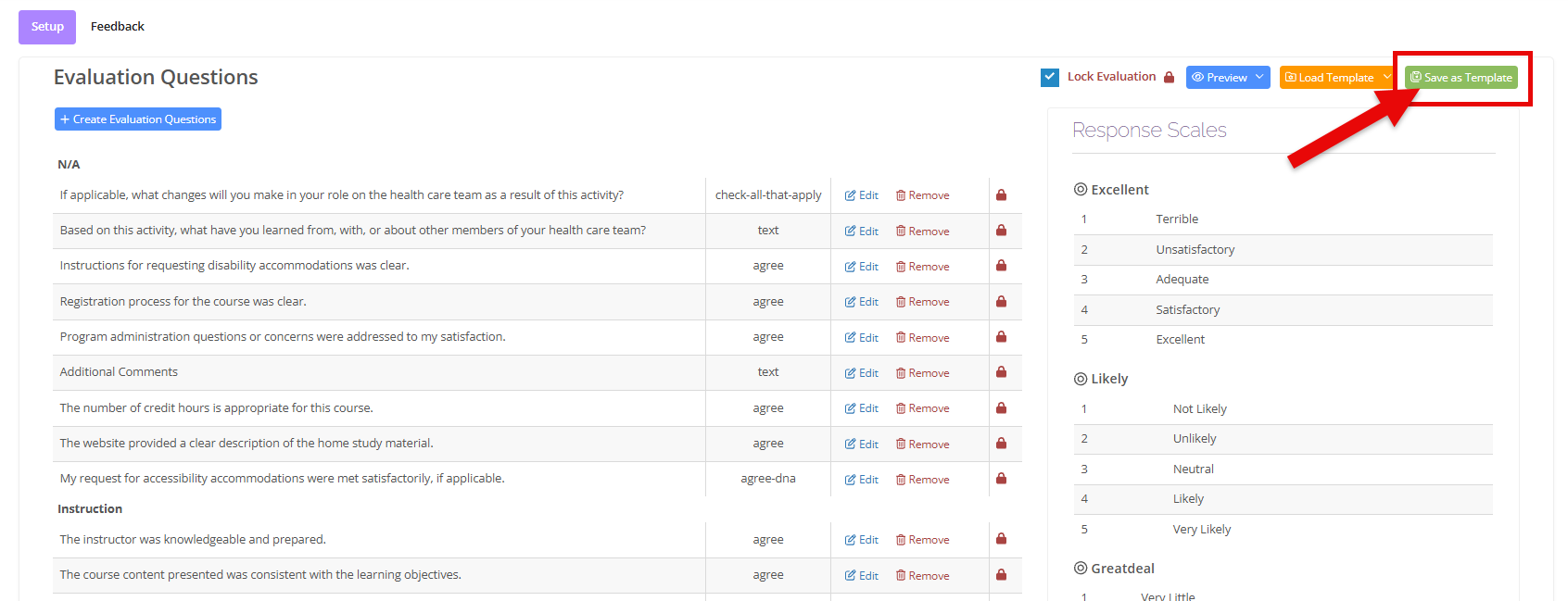 Once you have entered all of the Evaluation Questions, you can click the green Save as Template button up at the top to Save. This will also save the question list for use with future courses.