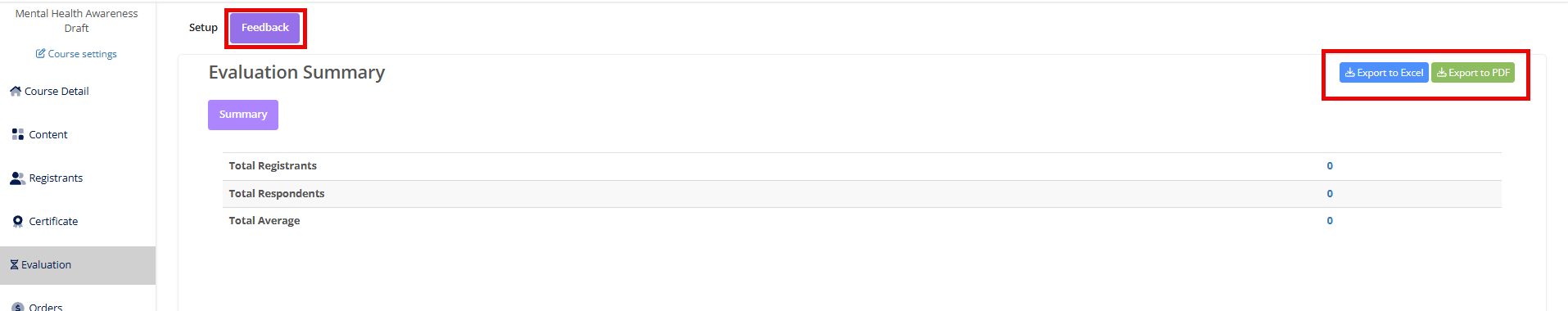 The Feedback tab allows you to see the responses collected from your Evaluation Questions. To download this data, you can Export to Excel, or Export to PDF.