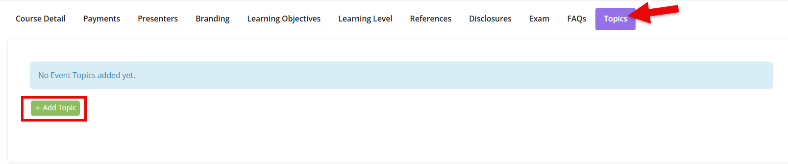 Once finished, click the Save button. You will now see under the Course Topics tab, the list of Event Topics you have entered.