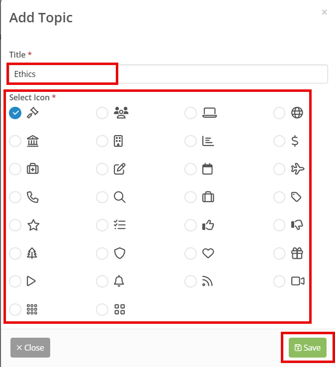 You will be prompted to type in a Topic Title, then Select an Icon that represents the Event Topic.