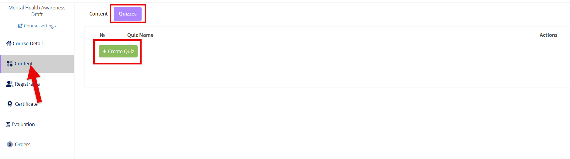 Under the Quizzes tab, you can opt to create a quiz for the attendees within a course.