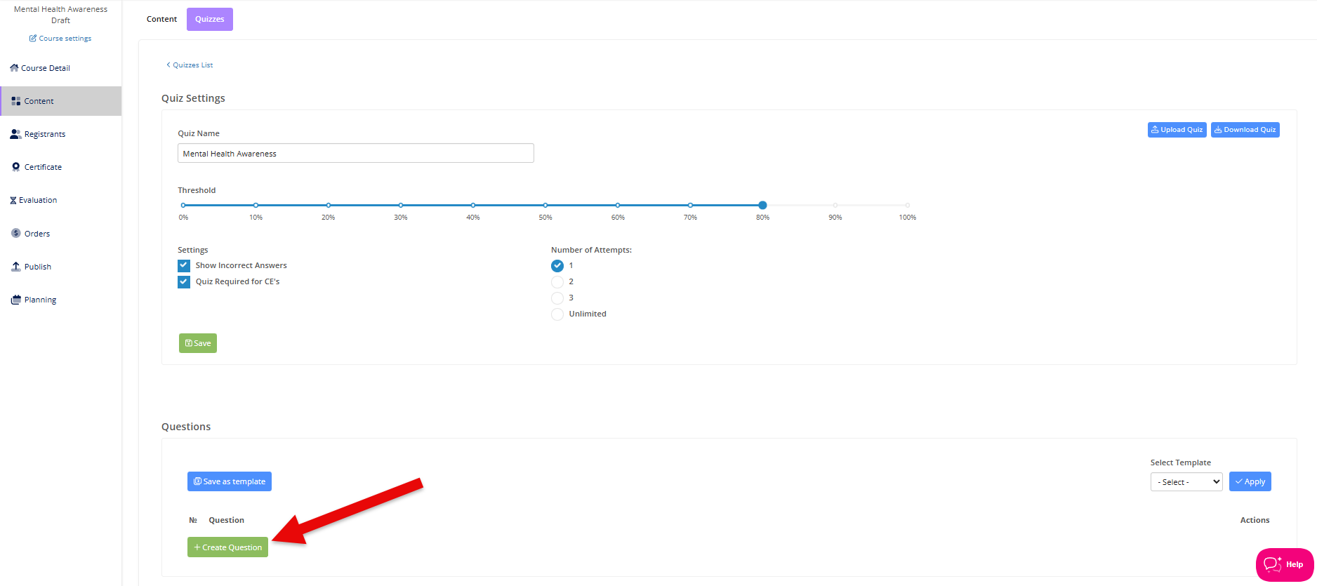 Click the green + Create Question button to begin to enter each quiz question.