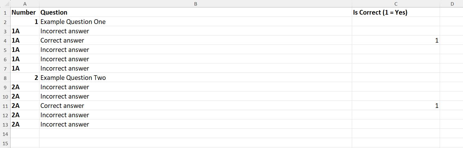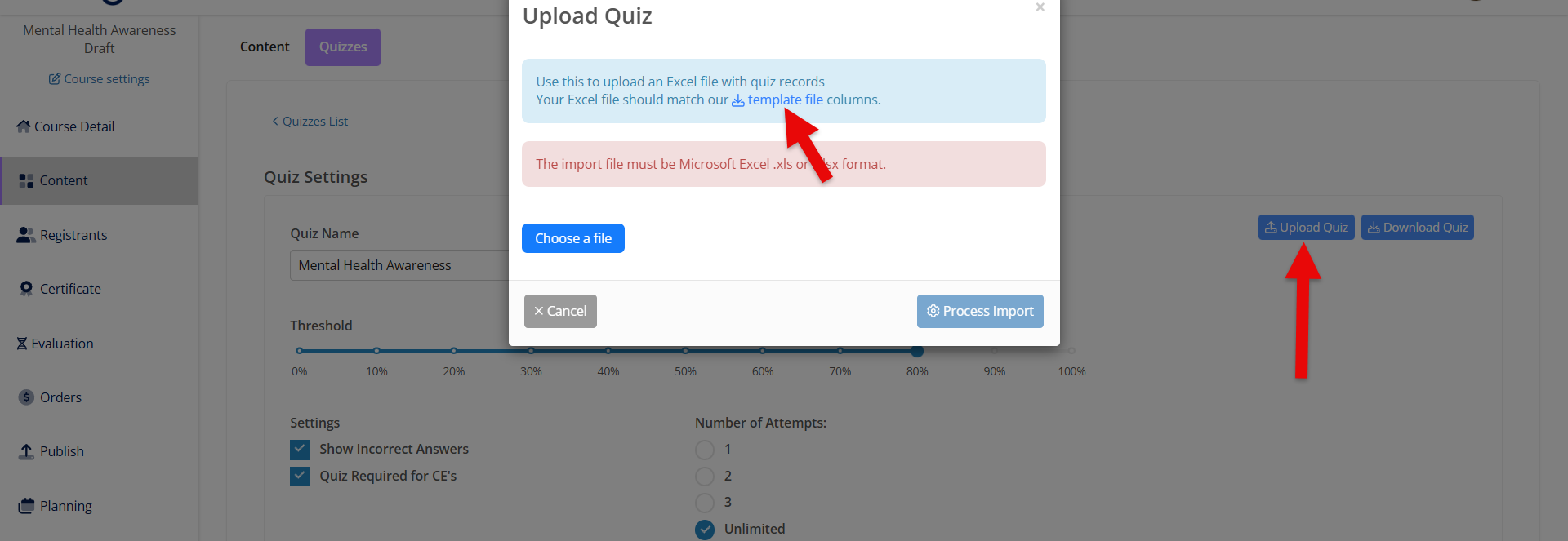 - Create the quiz questions, or upload the questions by following the template