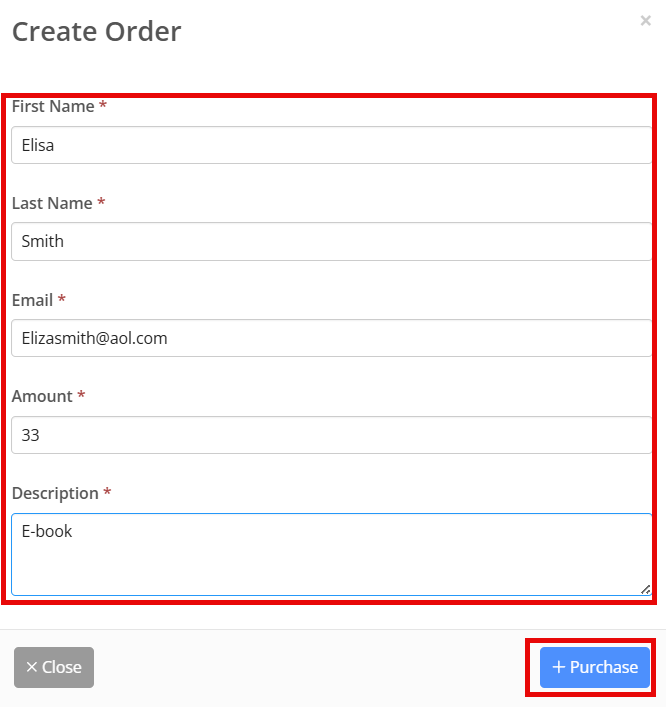 Enter the payor's first name, last name, email, the amount to be paid, and a description of what the charge is for, then click + Purchase.