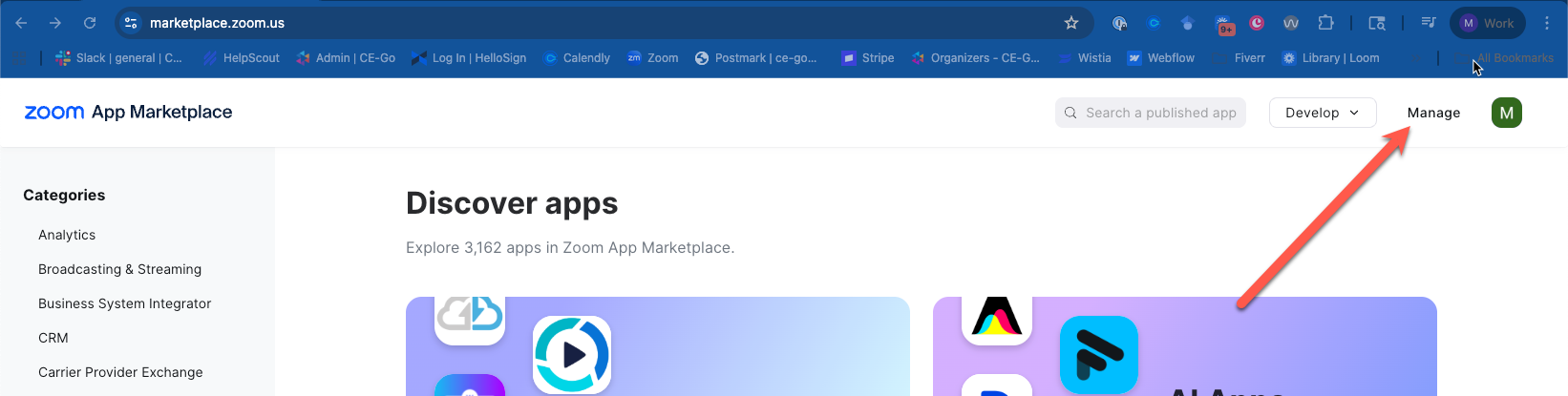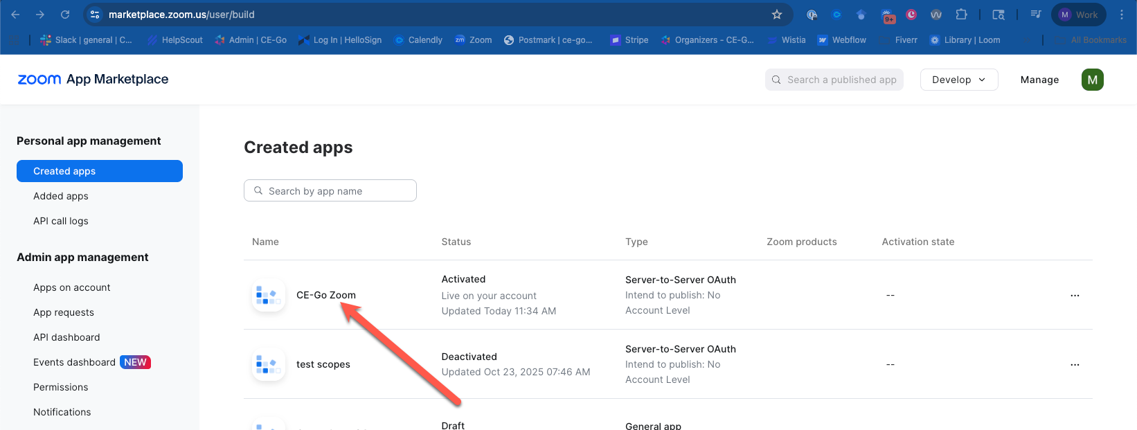 3. Select the app created during your CE-Go Zoom Integration (your app name may differ from what is shown below):