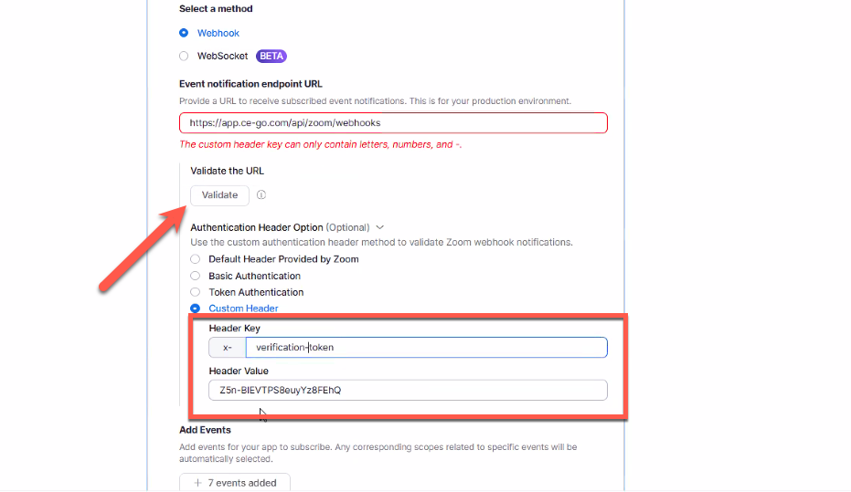 7. In the Header Key field, type "verification-token". In the Header Value field paste the Account ID, previously copied. Then click the Validate button above. Click Save.